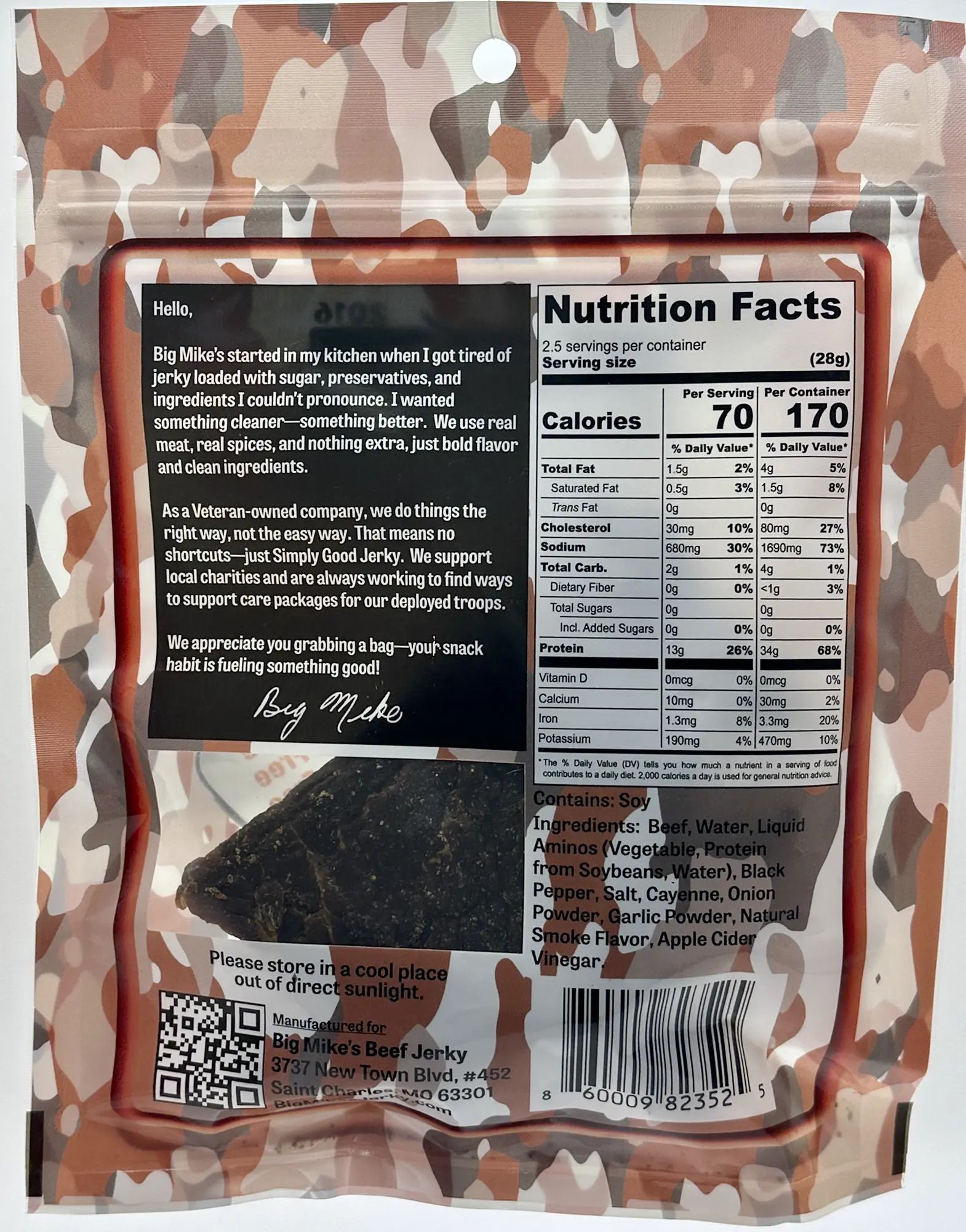 Big Mike’s Spicy Beef Jerky combines the rich, smoky flavor of premium beef with the bold heat of black pepper and cayenne for the perfect spicy kick. This high-protein, low-carb snack is sugar-free, gluten-free, and nitrate-free, making it a clean, energizing option for those who crave heat without the junk.